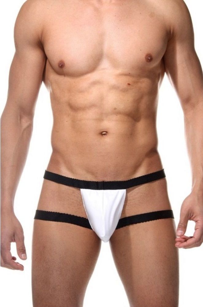 Трусы мужские из белого гладкого материала, с полностью открытыми ягодицами и черными резинками на бедрах.