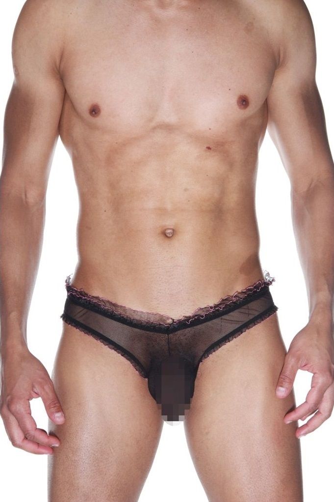 Мужские черные трусы-слипы из мягкой полупрозрачной ткани. На ягодицах сборка, окантованы мелкой рюшей с бледно-розовой отстрочкой.