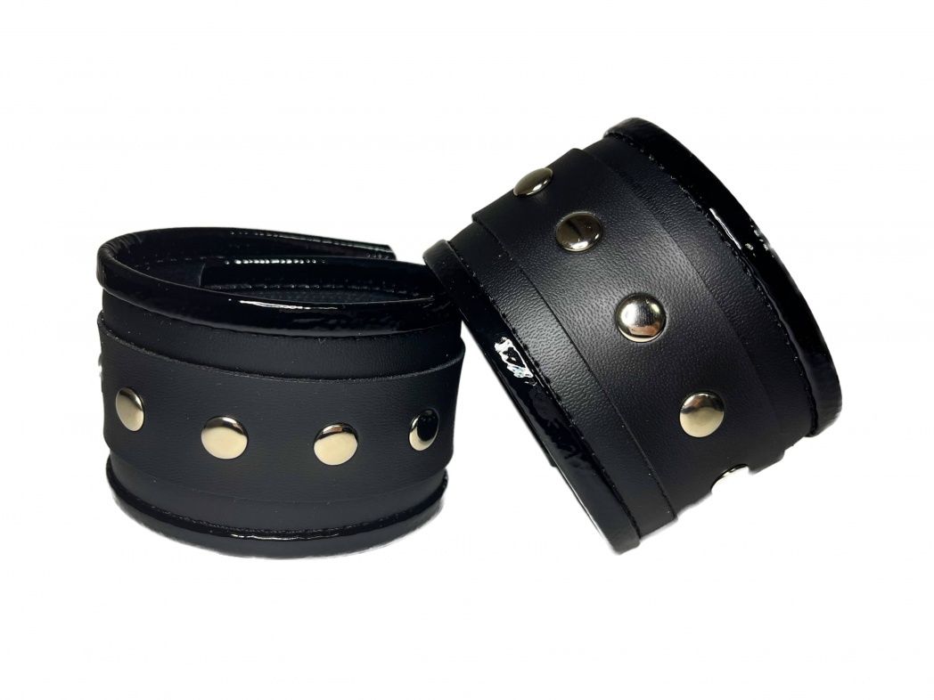 Красивые и функциональные наручники черного цвета, выполненные из искусственной кожи. Декорированы металлической фурнитурой и лаковыми вставками по краям. Обхват удобно регулируется с помощью пряжек. В комплекте идет соединение с карабинами. Очень экономичный, экологичный и практически незаменимый аксессуар для вашей любовной игры! Ширина - 5,5 см. Длина соединения - 11 см.