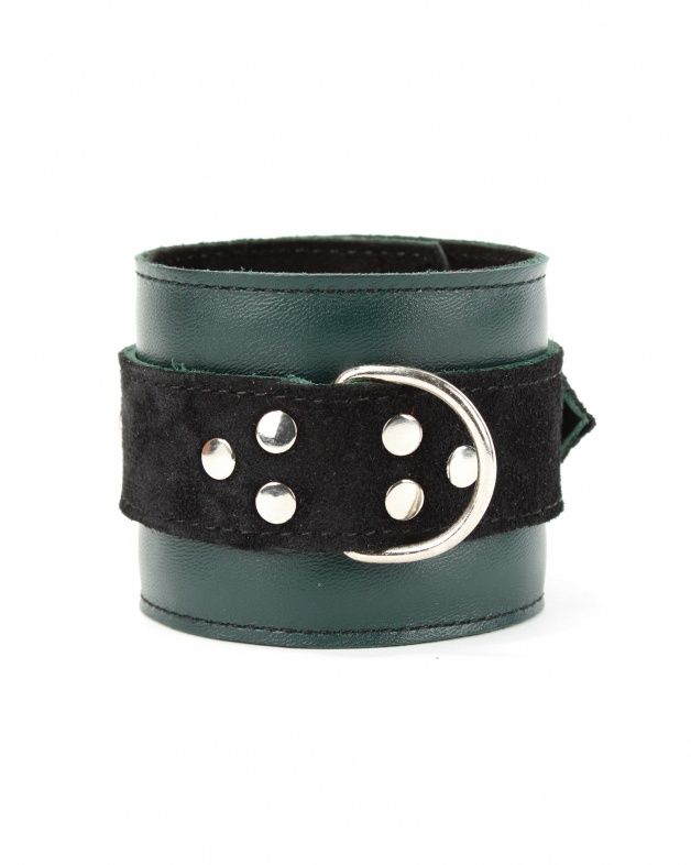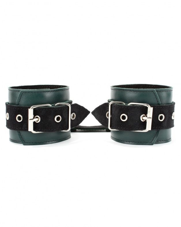 Наручники выполнены из натуральной кожи. Изделие декорировано ремнями из замши. Посредине наручника расположено полукольцо из сварной фурнитуры. Наручники надежно фиксируются пряжками и ремнями, позволяющими выбрать нужный размер, кожаное соединение на карабинах фиксирует наручники вместе. Стильные наручники отлично подходят для воплощения эротических БДСМ игр.